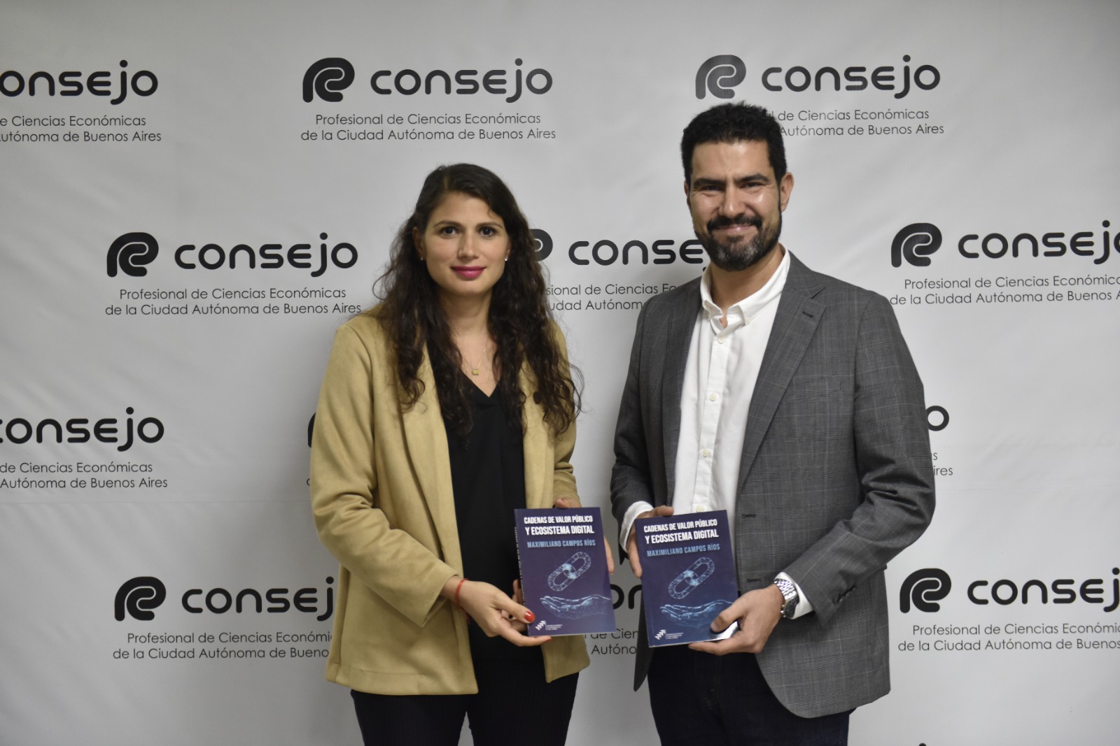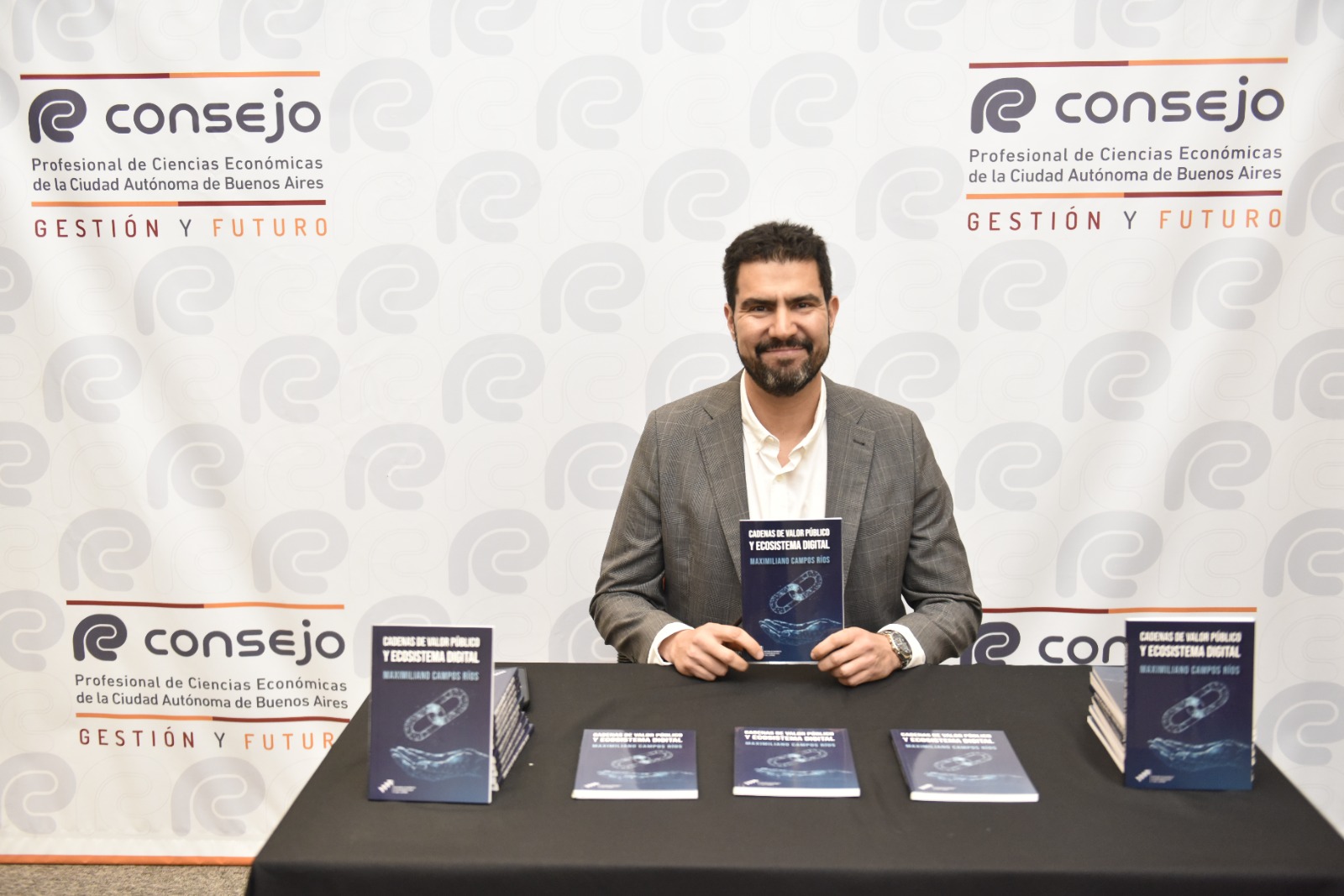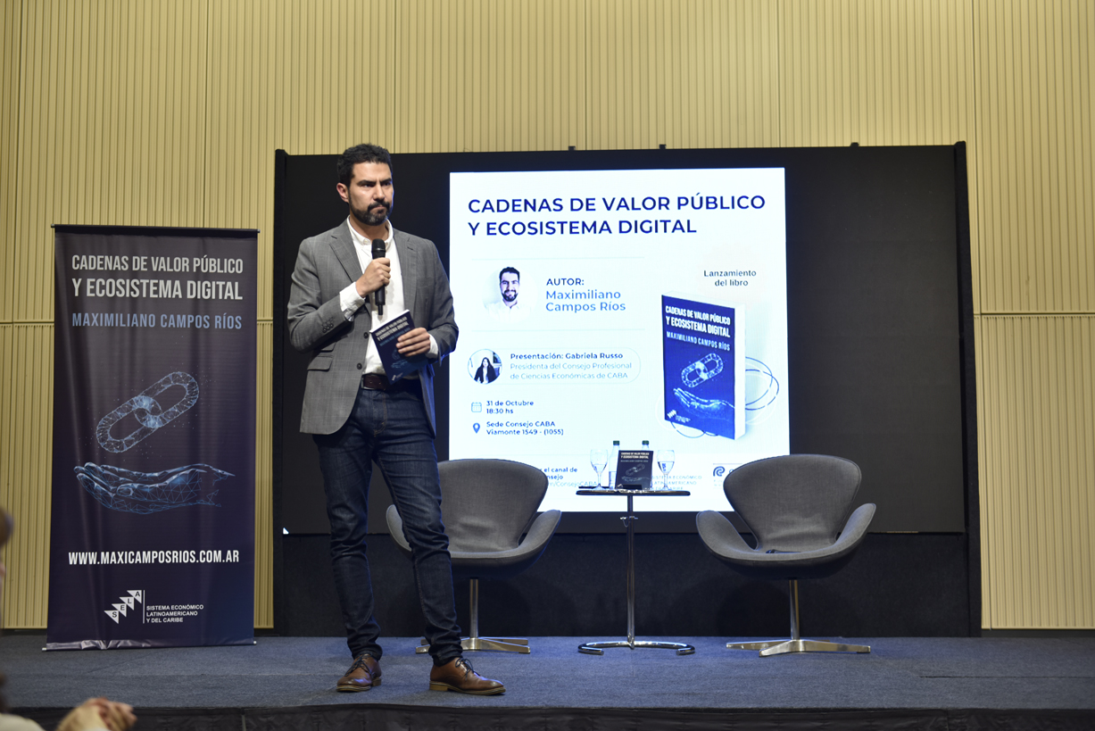 El politólogo y consultor, Maximiliano Campos Ríos, presentó anoche ante un gran marco de público en el Consejo Profesional de Ciencias Económicas de la Ciudad Autónoma de Buenos Aires su último libro “CADENAS DE VALOR PÚBLICO Y ECOSISTEMA DIGITAL” editado por el Sistema Económico Latinoamericano y del Caribe (SELA).