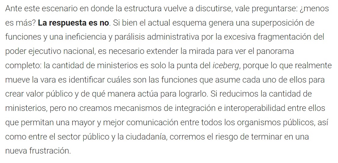 Ante este escenario en donde la estructura vuelve a discutirse, vale preguntarse: ¿menos es más? La respuesta es no. Si bien el actual esquema genera una superposición de funciones y una ineficiencia y parálisis administrativa por la excesiva fragmentación del poder ejecutivo nacional, es necesario extender la mirada para ver el panorama completo: la cantidad de ministerios es solo la punta del iceberg, porque lo que realmente mueve la vara es identificar cuáles son las funciones que asume cada uno de ellos para crear valor público y de qué manera actúa para lograrlo. Si reducimos la cantidad de ministerios, pero no creamos mecanismos de integración e interoperabilidad entre ellos que permitan una mayor y mejor comunicación entre todos los organismos públicos, así como entre el sector público y la ciudadanía, corremos el riesgo de terminar en una nueva frustración.