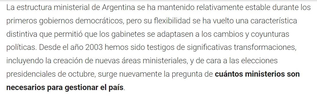 La estructura ministerial de Argentina se ha mantenido relativamente estable durante los primeros gobiernos democráticos, pero su flexibilidad se ha vuelto una característica distintiva que permitió que los gabinetes se adaptasen a los cambios y coyunturas políticas. Desde el año 2003 hemos sido testigos de significativas transformaciones, incluyendo la creación de nuevas áreas ministeriales, y de cara a las elecciones presidenciales de octubre, surge nuevamente la pregunta de cuántos ministerios son necesarios para gestionar el país.