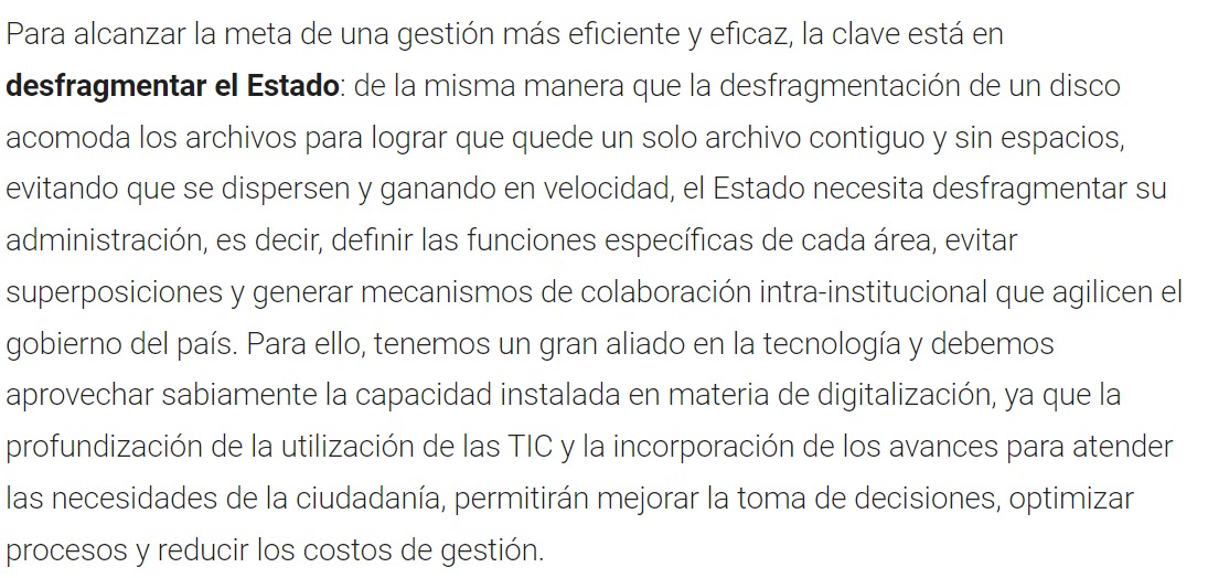 Para alcanzar la meta de una gestión más eficiente y eficaz, la clave está en desfragmentar el Estado: de la misma manera que la desfragmentación de un disco acomoda los archivos para lograr que quede un solo archivo contiguo y sin espacios, evitando que se dispersen y ganando en velocidad, el Estado necesita desfragmentar su administración, es decir, definir las funciones específicas de cada área, evitar superposiciones y generar mecanismos de colaboración intrainstitucional que agilicen el gobierno del país. Para ello, tenemos un gran aliado en la tecnología y debemos aprovechar sabiamente la capacidad instalada en materia de digitalización, ya que la profundización de la utilización de las TIC y la incorporación de los avances para atender las necesidades de la ciudadanía, permitirán mejorar la toma de decisiones, optimizar procesos y reducir los costos de gestión.