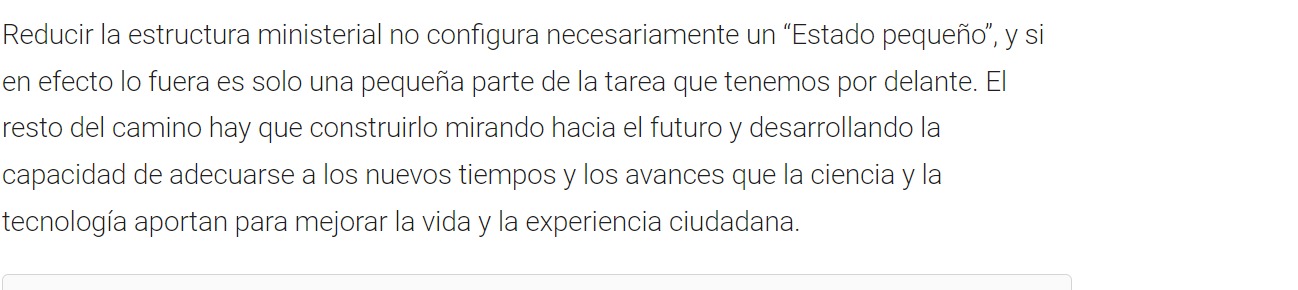 Reducir la estructura ministerial no configura necesariamente un “Estado pequeño”, y si en efecto lo fuera es solo una pequeña parte de la tarea que tenemos por delante. El resto del camino hay que construirlo mirando hacia el futuro y desarrollando la capacidad de adecuarse a los nuevos tiempos y los avances que la ciencia y la tecnología aportan para mejorar la vida y la experiencia ciudadana.