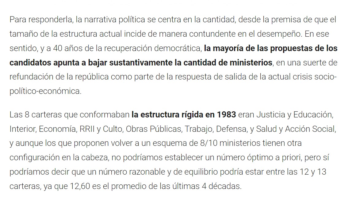 Para responderla, la narrativa política se centra en la cantidad, desde la premisa de que el tamaño de la estructura actual incide de manera contundente en el desempeño. En ese sentido, y a 40 años de la recuperación democrática, la mayoría de las propuestas de los candidatos apunta a bajar sustantivamente la cantidad de ministerios, en una suerte de refundación de la república como parte de la respuesta de salida de la actual crisis socio-político-económica.