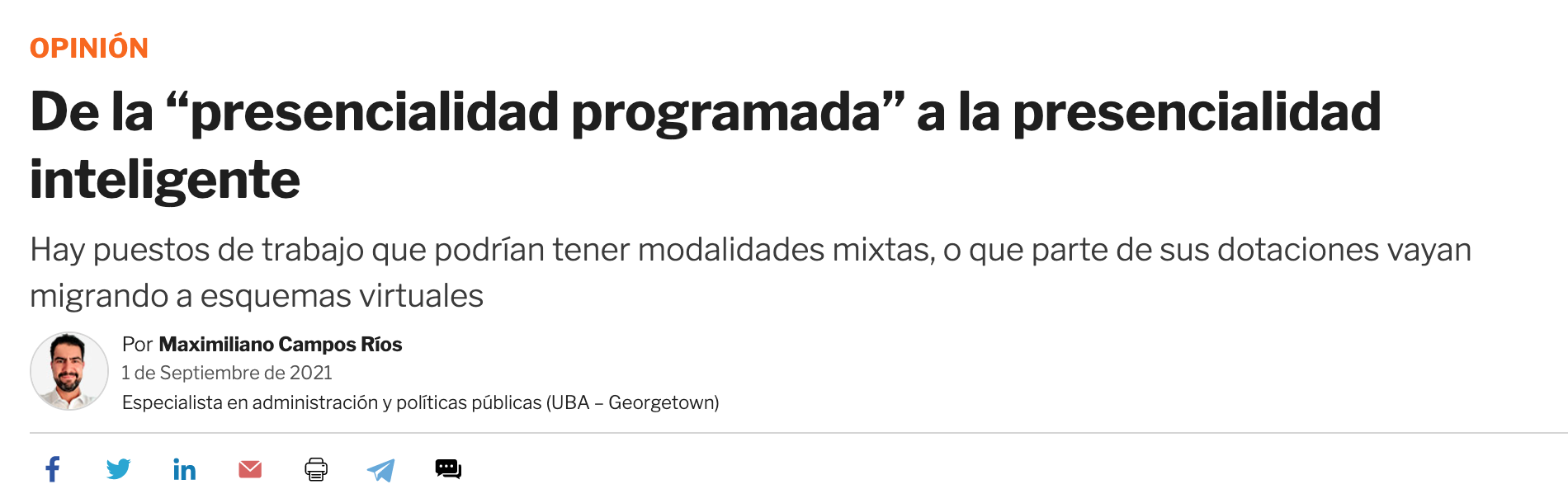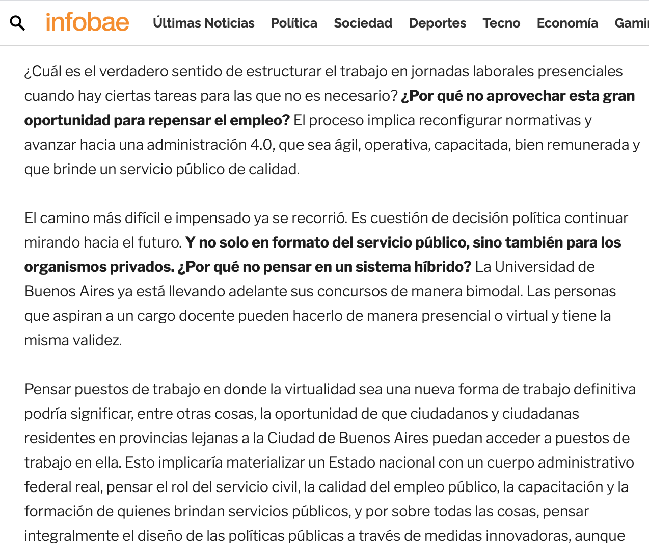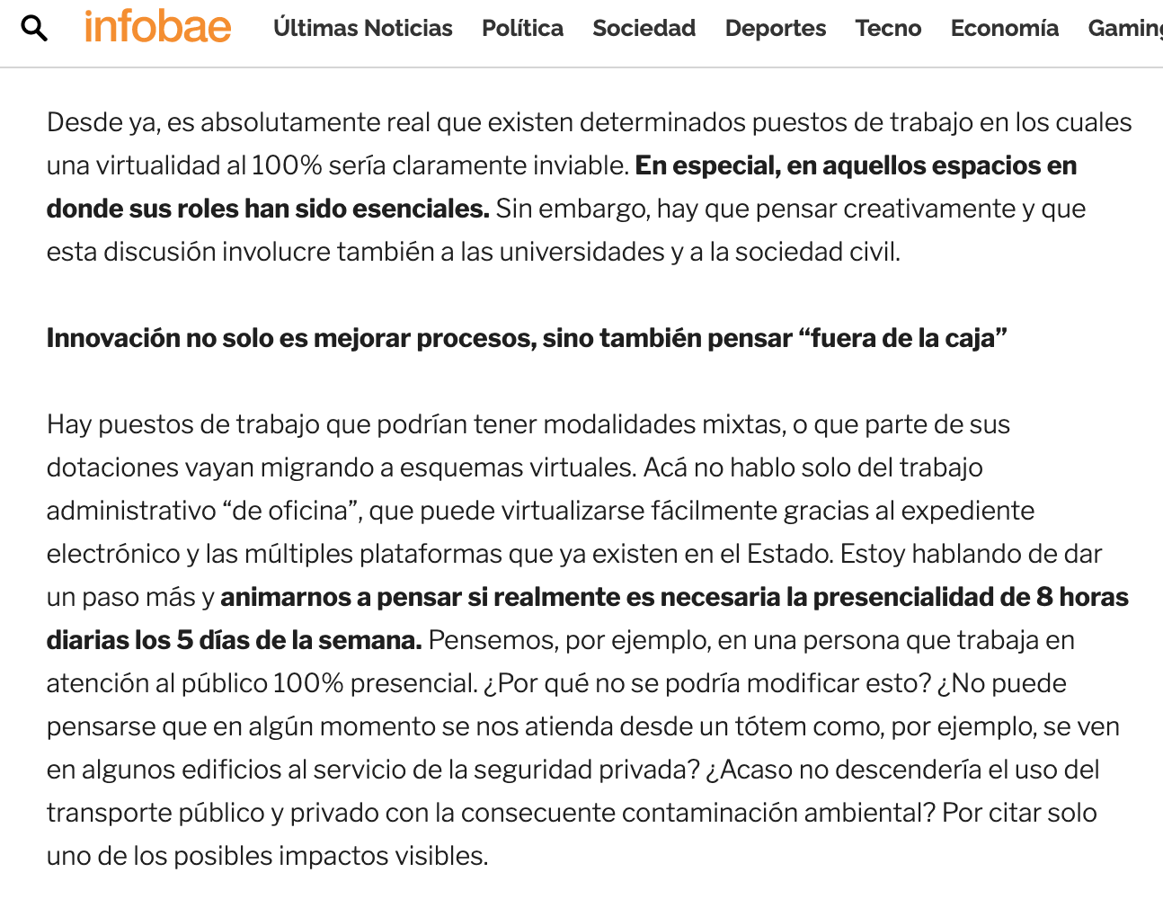 Desde ya, es absolutamente real que existen determinados puestos de trabajo en los cuales una virtualidad al 100% sería claramente inviable. En especial, en aquellos espacios en donde sus roles han sido esenciales. Sin embargo, hay que pensar creativamente y que esta discusión involucre también a las universidades y a la sociedad civil.