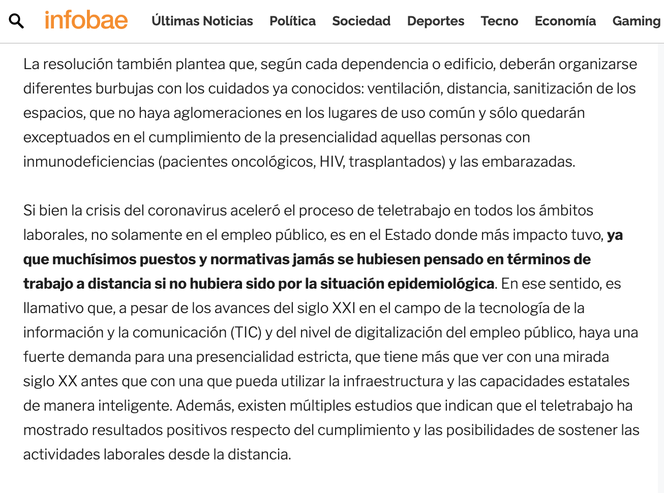 Si bien la crisis del coronavirus aceleró el proceso de teletrabajo en todos los ámbitos laborales, no solamente en el empleo público, es en el Estado donde más impacto tuvo, ya que muchísimos puestos y normativas jamás se hubiesen pensado en términos de trabajo a distancia si no hubiera sido por la situación epidemiológica. En ese sentido, es llamativo que, a pesar de los avances del siglo XXI en el campo de la tecnología de la información y la comunicación (TIC) y del nivel de digitalización del empleo público, haya una fuerte demanda para una presencialidad estricta, que tiene más que ver con una mirada siglo XX antes que con una que pueda utilizar la infraestructura y las capacidades estatales de manera inteligente. Además, existen múltiples estudios que indican que el teletrabajo ha mostrado resultados positivos respecto del cumplimiento y las posibilidades de sostener las actividades laborales desde la distancia.