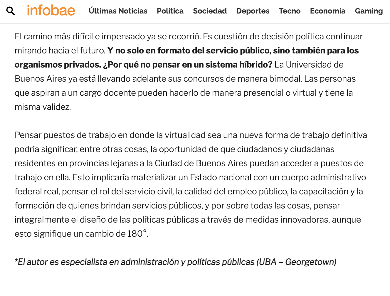Pensar puestos de trabajo en donde la virtualidad sea una nueva forma de trabajo definitiva podría significar, entre otras cosas, la oportunidad de que ciudadanos y ciudadanas residentes en provincias lejanas a la Ciudad de Buenos Aires puedan acceder a puestos de trabajo en ella. Esto implicaría materializar un Estado nacional con un cuerpo administrativo federal real, pensar el rol del servicio civil, la calidad del empleo público, la capacitación y la formación de quienes brindan servicios públicos, y por sobre todas las cosas, pensar integralmente el diseño de las políticas públicas a través de medidas innovadoras, aunque esto signifique un cambio de 180°.