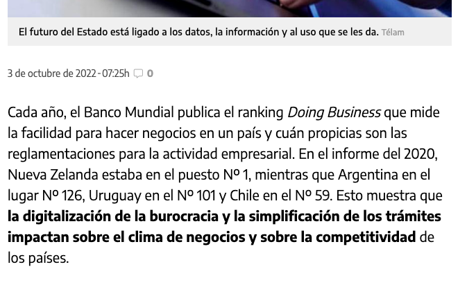 Cada año, el Banco Mundial publica el ranking Doing Business que mide la facilidad para hacer negocios en un país y cuán propicias son las reglamentaciones para la actividad empresarial. En el informe del 2020, Nueva Zelanda estaba en el puesto Nº 1, mientras que Argentina en el lugar Nº 126, Uruguay en el Nº 101 y Chile en el Nº 59. Esto muestra que la digitalización de la burocracia y la simplificación de los trámites impactan sobre el clima de negocios y sobre la competitividad de los países.