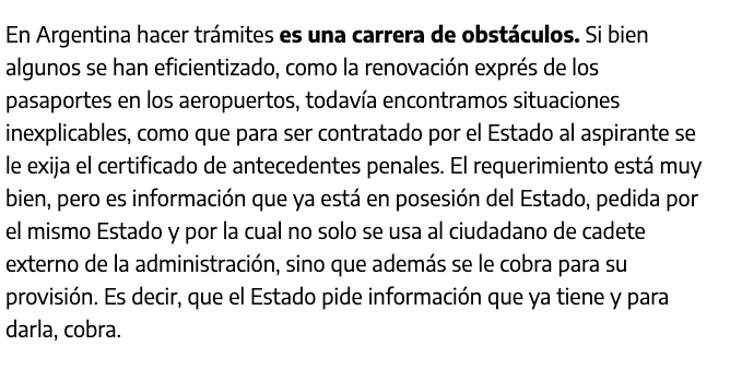 En Argentina hacer trámites es una carrera de obstáculos. Si bien algunos se han eficientizado, como la renovación exprés de los pasaportes en los aeropuertos, todavía encontramos situaciones inexplicables, como que para ser contratado por el Estado al aspirante se le exija el certificado de antecedentes penales. El requerimiento está muy bien, pero es información que ya está en posesión del Estado, pedida por el mismo Estado y por la cual no solo se usa al ciudadano de cadete externo de la administración, sino que además se le cobra para su provisión. Es decir, que el Estado pide información que ya tiene y para darla, cobra.