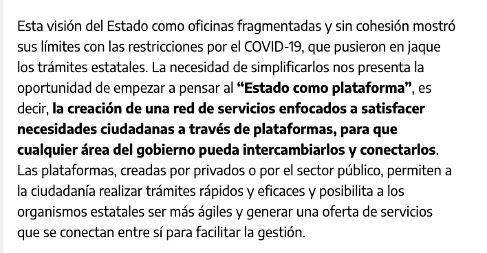 Esta visión del Estado como oficinas fragmentadas y sin cohesión mostró sus límites con las restricciones por el COVID-19, que pusieron en jaque los trámites estatales. La necesidad de simplificarlos nos presenta la oportunidad de empezar a pensar al “Estado como plataforma”, es decir, la creación de una red de servicios enfocados a satisfacer necesidades ciudadanas a través de plataformas, para que cualquier área del gobierno pueda intercambiarlos y conectarlos. Las plataformas, creadas por privados o por el sector público, permiten a la ciudadanía realizar trámites rápidos y eficaces y posibilita a los organismos estatales ser más ágiles y generar una oferta de servicios que se conectan entre sí para facilitar la gestión.