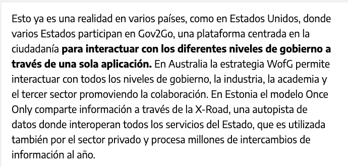 Esto ya es una realidad en varios países, como en Estados Unidos, donde varios Estados participan en Gov2Go, una plataforma centrada en la ciudadanía para interactuar con los diferentes niveles de gobierno a través de una sola aplicación. En Australia la estrategia WofG permite interactuar con todos los niveles de gobierno, la industria, la academia y el tercer sector promoviendo la colaboración. En Estonia el modelo Once Only comparte información a través de la X-Road, una autopista de datos donde interoperan todos los servicios del Estado, que es utilizada también por el sector privado y procesa millones de intercambios de información al año.