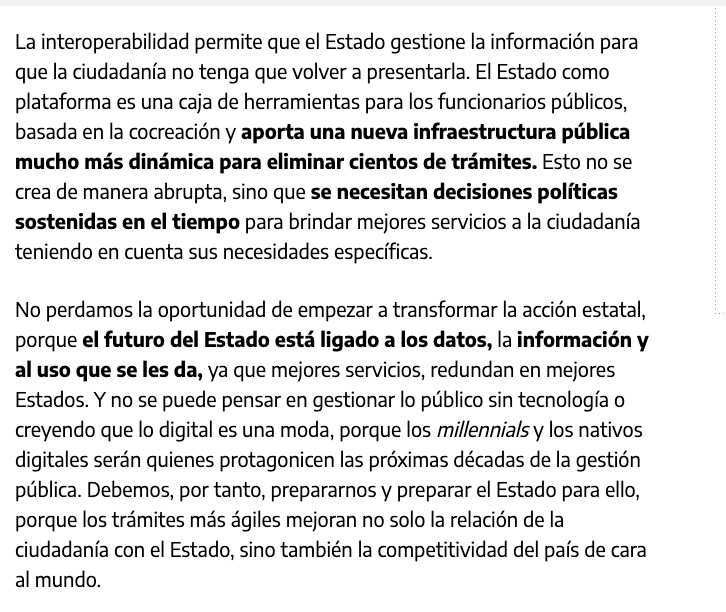 No perdamos la oportunidad de empezar a transformar la acción estatal, porque el futuro del Estado está ligado a los datos, la información y al uso que se les da, ya que mejores servicios, redundan en mejores Estados. Y no se puede pensar en gestionar lo público sin tecnología o creyendo que lo digital es una moda, porque los millennials y los nativos digitales serán quienes protagonicen las próximas décadas de la gestión pública. Debemos, por tanto, prepararnos y preparar el Estado para ello, porque los trámites más ágiles mejoran no solo la relación de la ciudadanía con el Estado, sino también la competitividad del país de cara al mundo.