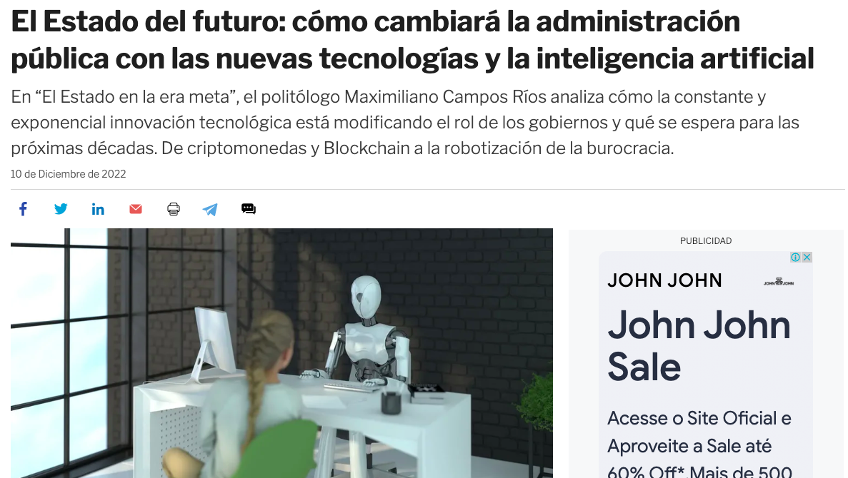 En “El Estado en la era meta”, el politólogo Maximiliano Campos Ríos analiza cómo la constante y exponencial innovación tecnológica está modificando el rol de los gobiernos y qué se espera para las próximas décadas. De criptomonedas y Blockchain a la robotización de la burocracia.
