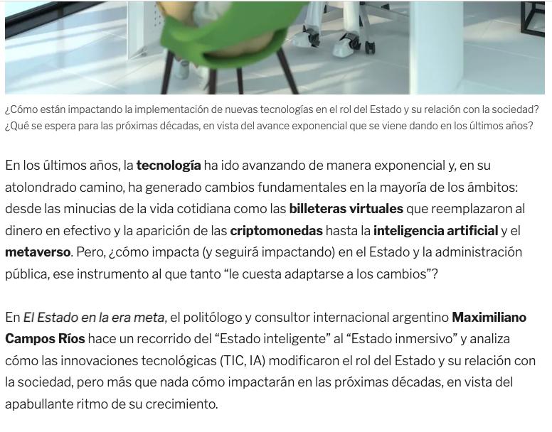 En El Estado en la era meta, el politólogo y consultor internacional argentino Maximiliano Campos Ríos hace un recorrido del “Estado inteligente” al “Estado inmersivo” y analiza cómo las innovaciones tecnológicas (TIC, IA) modificaron el rol del Estado y su relación con la sociedad, pero más que nada cómo impactarán en las próximas décadas, en vista del apabullante ritmo de su crecimiento.