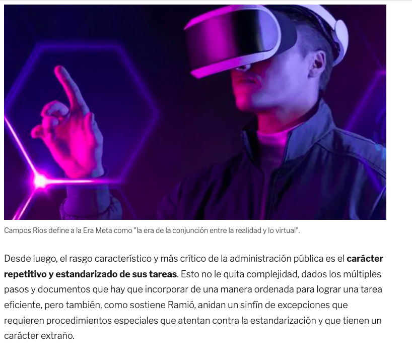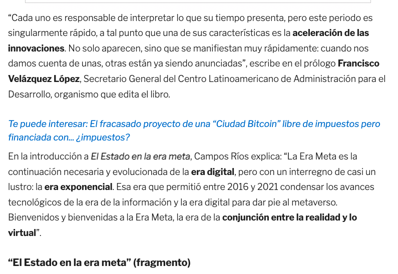 En la introducción a El Estado en la era meta, Campos Ríos explica: “La Era Meta es la continuación necesaria y evolucionada de la era digital, pero con un interregno de casi un lustro: la era exponencial. Esa era que permitió entre 2016 y 2021 condensar los avances tecnológicos de la era de la información y la era digital para dar pie al metaverso. Bienvenidos y bienvenidas a la Era Meta, la era de la conjunción entre la realidad y lo virtual”.