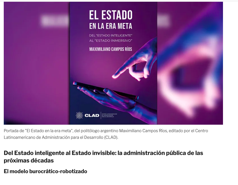 Portada de «El Estado en la era meta», del politólogo argentino Maximiliano Campos Ríos, editado por el Centro Latinoamericano de Administración para el Desarrollo (CLAD).Del Estado inteligente al Estado invisible: la administración pública de las próximas décadas