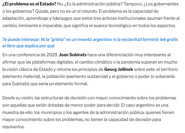 En una conferencia de 2020, Joan Subirats hace una diferenciación muy interesante al afirmar que las plataformas digitales, el cambio climático o la pandemia superan en mucho la visión clásica de Estado y retoma los principios de Georg Jellinek sobre este: el territorio (elemento material), la población (elemento sustancial) y el gobierno o poder (o soberanía para Subirats) que sería un elemento formal.