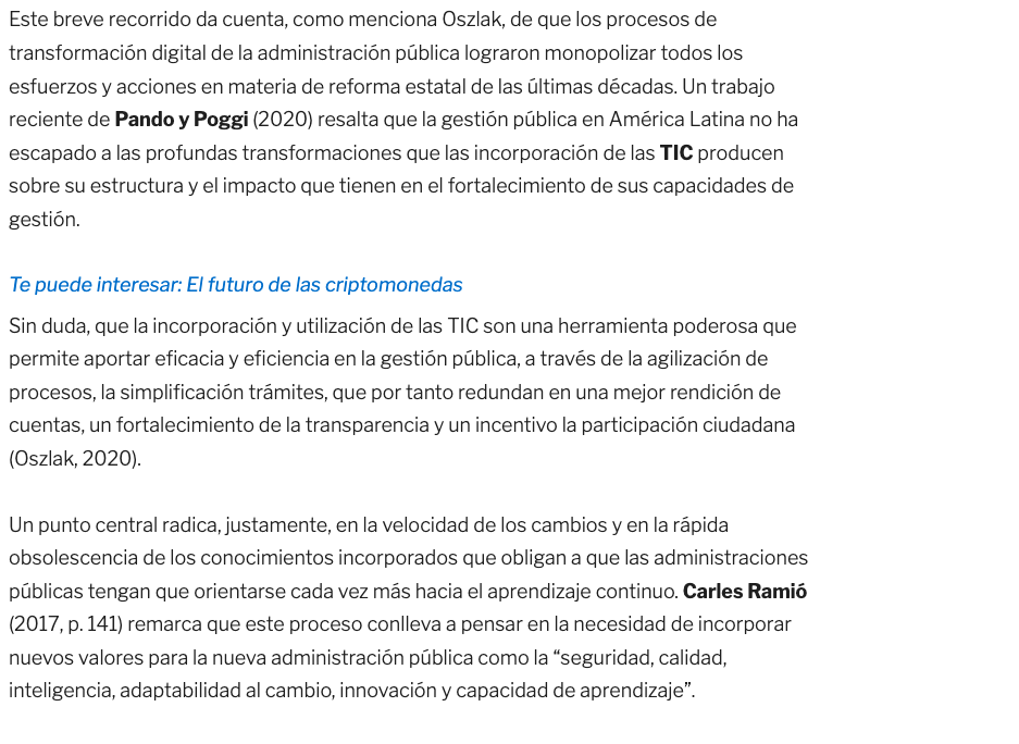 Este breve recorrido da cuenta, como menciona Oszlak, de que los procesos de transformación digital de la administración pública lograron monopolizar todos los esfuerzos y acciones en materia de reforma estatal de las últimas décadas. Un trabajo reciente de Pando y Poggi (2020) resalta que la gestión pública en América Latina no ha escapado a las profundas transformaciones que las incorporación de las TIC producen sobre su estructura y el impacto que tienen en el fortalecimiento de sus capacidades de gestión.