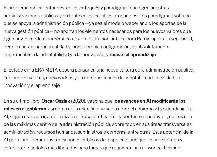 El problema radica, entonces, en los enfoques y paradigmas que rigen nuestras administraciones públicas y no tanto en los cambios producidos. Los paradigmas sobre lo que se apoya la administración pública —ya sea el modelo weberiano o los aportes de la nueva gestión pública— no aportan los elementos necesarios para los nuevos valores que rigen hoy. El modelo burocrático de administración pública para Ramió aporta la seguridad, pero le cuesta lograr la calidad y, por su propia configuración, es absolutamente impermeable a la adaptabilidad y a la innovación, y resiste el aprendizaje.