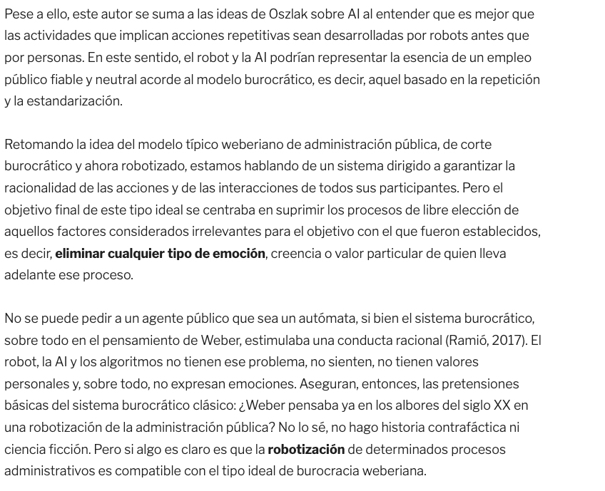 No se puede pedir a un agente público que sea un autómata, si bien el sistema burocrático, sobre todo en el pensamiento de Weber, estimulaba una conducta racional (Ramió, 2017). El robot, la AI y los algoritmos no tienen ese problema, no sienten, no tienen valores personales y, sobre todo, no expresan emociones. Aseguran, entonces, las pretensiones básicas del sistema burocrático clásico: ¿Weber pensaba ya en los albores del siglo XX en una robotización de la administración pública? No lo sé, no hago historia contrafáctica ni ciencia ficción. Pero si algo es claro es que la robotización de determinados procesos administrativos es compatible con el tipo ideal de burocracia weberiana.