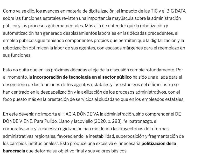 En este devenir, no importa el HACIA DÓNDE VA la administración, sino comprender el DE DÓNDE VIENE. Para Pulido, Llano y Iacoviello (2020, p. 283), “el patronazgo, el corporativismo y la excesiva rigidización han moldeado las trayectorias de reformas administrativas regionales, favoreciendo la inestabilidad, superposición y fragmentación de los cambios institucionales”. Esto produce una excesiva e innecesaria politización de la burocracia que deforma su objetivo final y sus valores básicos.