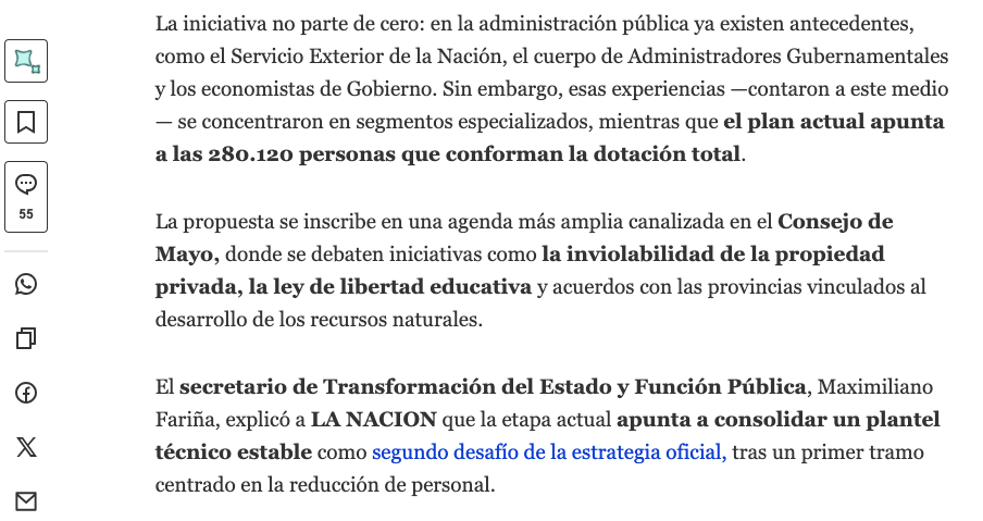 La iniciativa no parte de cero: en la administración pública ya existen antecedentes, como el Servicio Exterior de la Nación, el cuerpo de Administradores Gubernamentales y los economistas de Gobierno. Sin embargo, esas experiencias —contaron a este medio— se concentraron en segmentos especializados, mientras que el plan actual apunta a las 280.120 personas que conforman la dotación total.