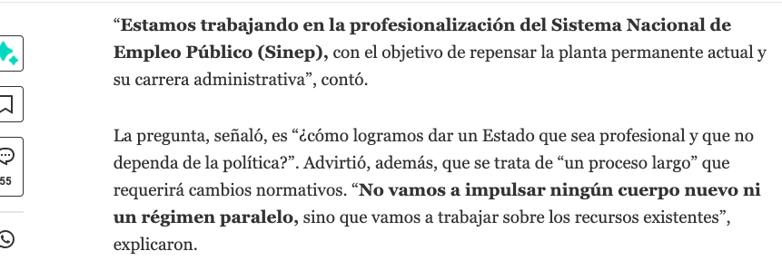 La pregunta, señaló, es “¿cómo logramos dar un Estado que sea profesional y que no dependa de la política?”. Advirtió, además, que se trata de “un proceso largo” que requerirá cambios normativos. “No vamos a impulsar ningún cuerpo nuevo ni un régimen paralelo, sino que vamos a trabajar sobre los recursos existentes”, explicaron.