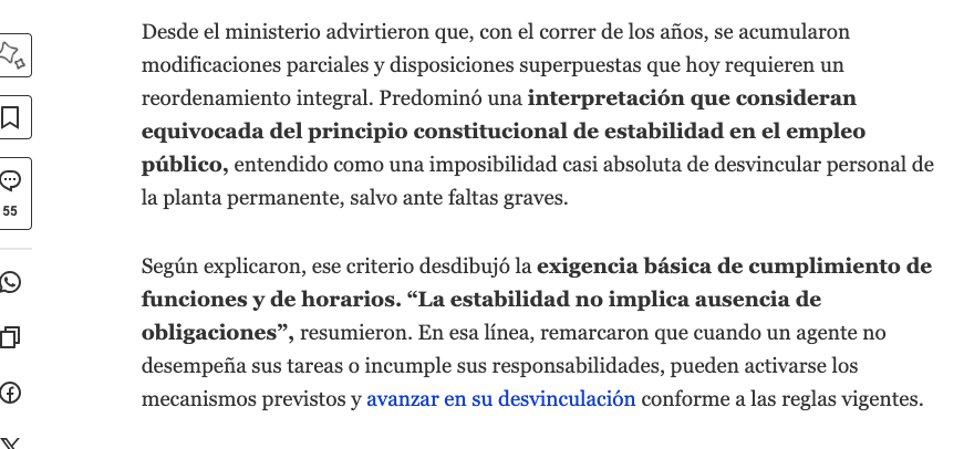 Según explicaron, ese criterio desdibujó la exigencia básica de cumplimiento de funciones y de horarios. “La estabilidad no implica ausencia de obligaciones”, resumieron. En esa línea, remarcaron que cuando un agente no desempeña sus tareas o incumple sus responsabilidades, pueden activarse los mecanismos previstos y avanzar en su desvinculación conforme a las reglas vigentes.