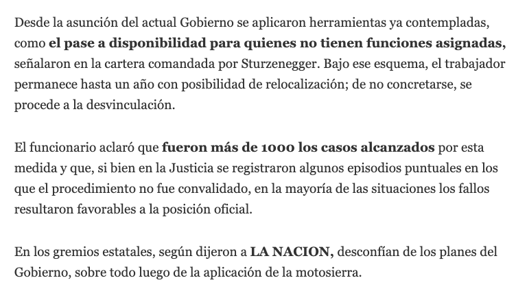 Desde la asunción del actual Gobierno se aplicaron herramientas ya contempladas, como el pase a disponibilidad para quienes no tienen funciones asignadas, señalaron en la cartera comandada por Sturzenegger. Bajo ese esquema, el trabajador permanece hasta un año con posibilidad de relocalización; de no concretarse, se procede a la desvinculación.