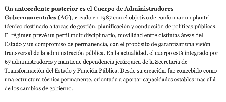 Un antecedente posterior es el Cuerpo de Administradores Gubernamentales (AG), creado en 1987 con el objetivo de conformar un plantel técnico destinado a tareas de gestión, planificación y conducción de políticas públicas. El régimen prevé un perfil multidisciplinario, movilidad entre distintas áreas del Estado y un compromiso de permanencia, con el propósito de garantizar una visión transversal de la administración pública. En la actualidad, el cuerpo está integrado por 67 administradores y mantiene dependencia jerárquica de la Secretaría de Transformación del Estado y Función Pública. Desde su creación, fue concebido como una estructura técnica permanente, orientada a aportar capacidades estables más allá de los cambios de gobierno.