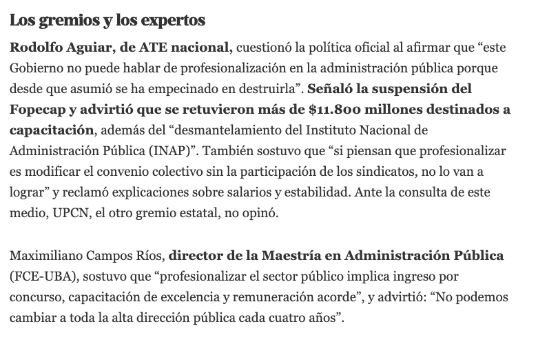 Rodolfo Aguiar, de ATE nacional, cuestionó la política oficial al afirmar que “este Gobierno no puede hablar de profesionalización en la administración pública porque desde que asumió se ha empecinado en destruirla”. Señaló la suspensión del Fopecap y advirtió que se retuvieron más de $11.800 millones destinados a capacitación, además del “desmantelamiento del Instituto Nacional de Administración Pública (INAP)”. También sostuvo que “si piensan que profesionalizar es modificar el convenio colectivo sin la participación de los sindicatos, no lo van a lograr” y reclamó explicaciones sobre salarios y estabilidad. Ante la consulta de este medio, UPCN, el otro gremio estatal, no opinó.