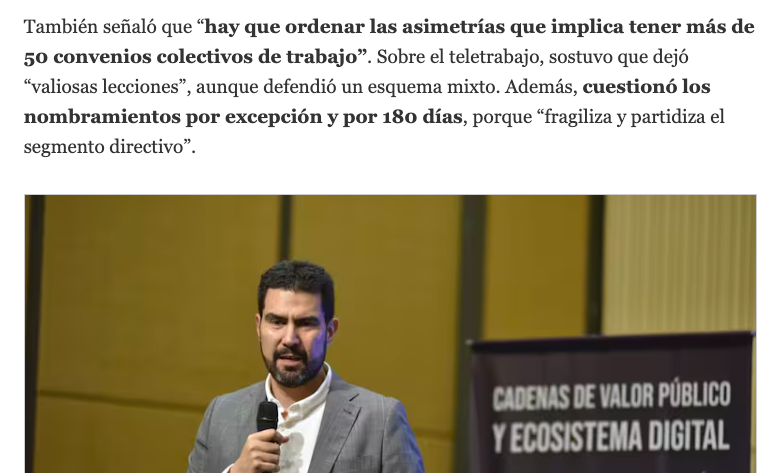 También señaló que “hay que ordenar las asimetrías que implica tener más de 50 convenios colectivos de trabajo”. Sobre el teletrabajo, sostuvo que dejó “valiosas lecciones”, aunque defendió un esquema mixto. Además, cuestionó los nombramientos por excepción y por 180 días, porque “fragiliza y partidiza el segmento directivo”.