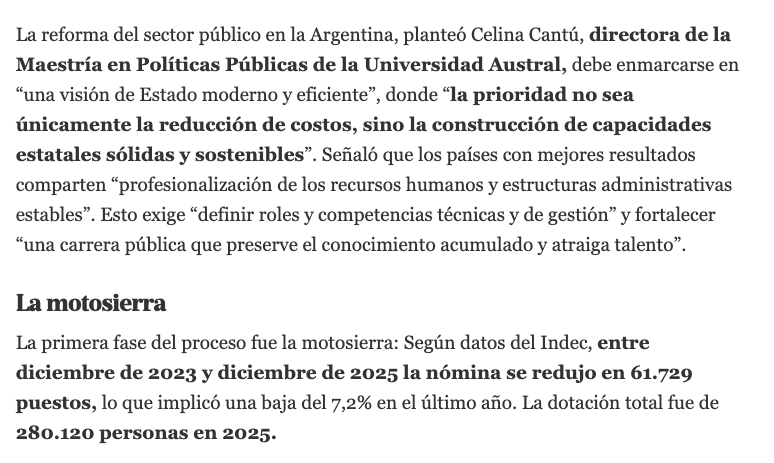 La reforma del sector público en la Argentina, planteó Celina Cantú, directora de la Maestría en Políticas Públicas de la Universidad Austral, debe enmarcarse en “una visión de Estado moderno y eficiente”, donde “la prioridad no sea únicamente la reducción de costos, sino la construcción de capacidades estatales sólidas y sostenibles”. Señaló que los países con mejores resultados comparten “profesionalización de los recursos humanos y estructuras administrativas estables”. Esto exige “definir roles y competencias técnicas y de gestión” y fortalecer “una carrera pública que preserve el conocimiento acumulado y atraiga talento”.
