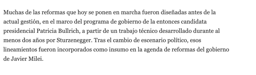 Muchas de las reformas que hoy se ponen en marcha fueron diseñadas antes de la actual gestión, en el marco del programa de gobierno de la entonces candidata presidencial Patricia Bullrich, a partir de un trabajo técnico desarrollado durante al menos dos años por Sturzenegger. Tras el cambio de escenario político, esos lineamientos fueron incorporados como insumo en la agenda de reformas del gobierno de Javier Milei.