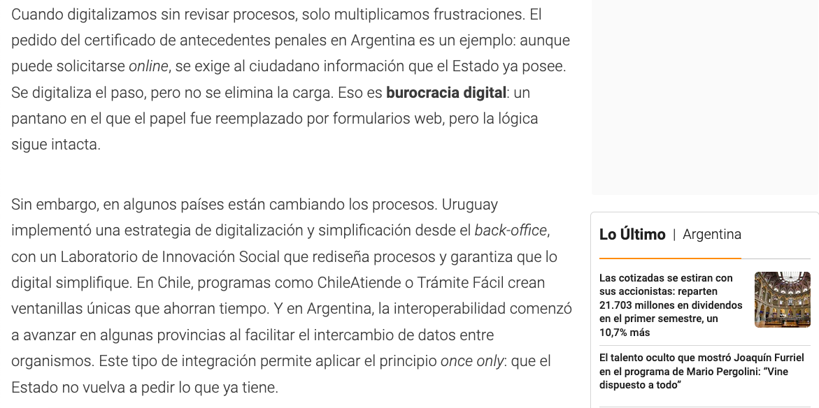 Cuando digitalizamos sin revisar procesos, solo multiplicamos frustraciones. El pedido del certificado de antecedentes penales en Argentina es un ejemplo: aunque puede solicitarse online, se exige al ciudadano información que el Estado ya posee. Se digitaliza el paso, pero no se elimina la carga. Eso es burocracia digital: un pantano en el que el papel fue reemplazado por formularios web, pero la lógica sigue intacta.