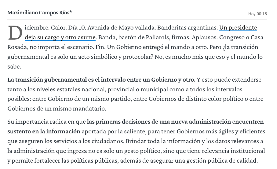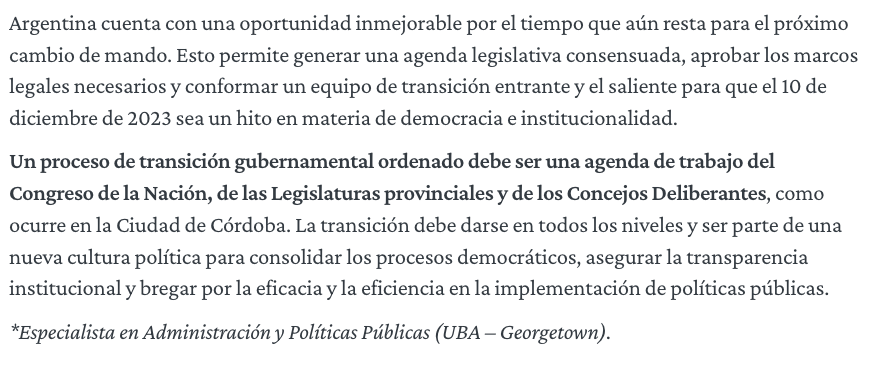 Argentina cuenta con una oportunidad inmejorable por el tiempo que aún resta para el próximo cambio de mando. Esto permite generar una agenda legislativa consensuada, aprobar los marcos legales necesarios y conformar un equipo de transición entrante y el saliente para que el 10 de diciembre de 2023 sea un hito en materia de democracia e institucionalidad.