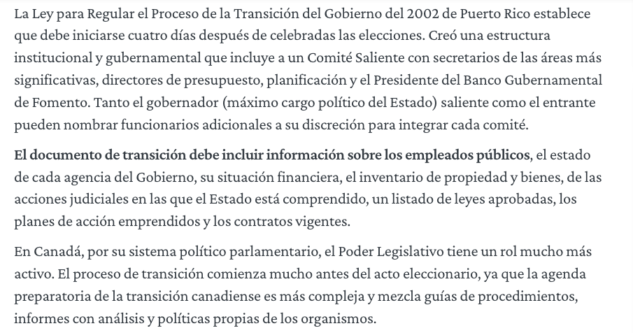 El documento de transición debe incluir información sobre los empleados públicos, el estado de cada agencia del Gobierno, su situación financiera, el inventario de propiedad y bienes, de las acciones judiciales en las que el Estado está comprendido, un listado de leyes aprobadas, los planes de acción emprendidos y los contratos vigentes.