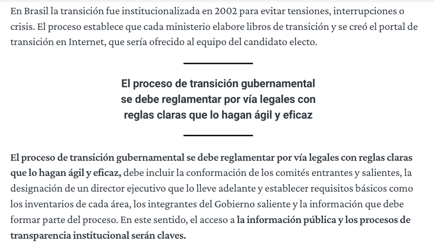 El proceso de transición gubernamental se debe reglamentar por vía legales con reglas claras que lo hagan ágil y eficaz, debe incluir la conformación de los comités entrantes y salientes, la designación de un director ejecutivo que lo lleve adelante y establecer requisitos básicos como los inventarios de cada área, los integrantes del Gobierno saliente y la información que debe formar parte del proceso. En este sentido, el acceso a la información pública y los procesos de transparencia institucional serán claves.