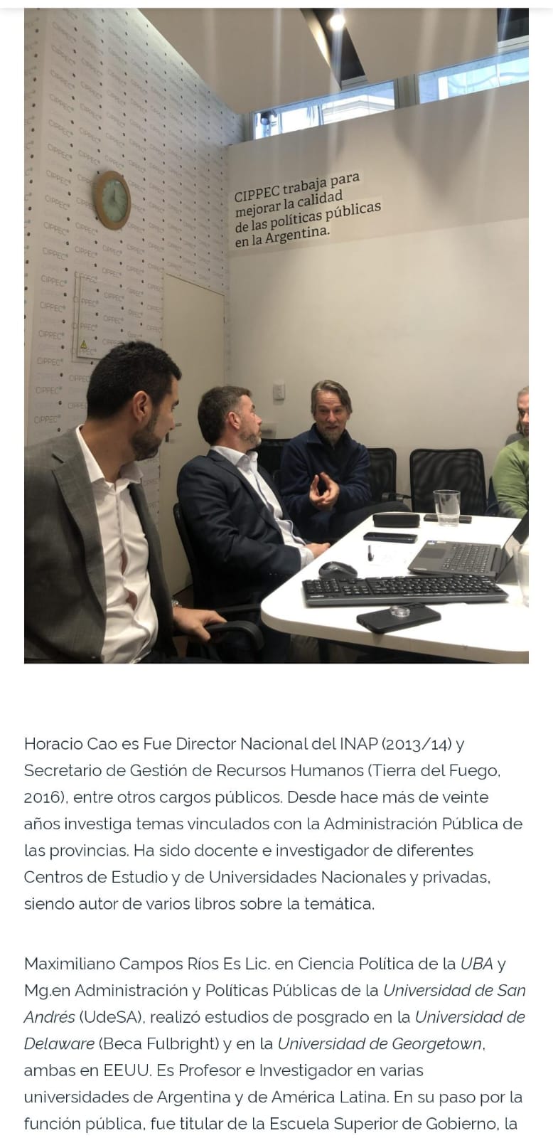 Horacio Cao es Fue Director Nacional del INAP (2013/14) y Secretario de Gestión de Recursos Humanos (Tierra del Fuego, 2016), entre otros cargos públicos. Desde hace más de veinte años investiga temas vinculados con la Administración Pública de las provincias. Ha sido docente e investigador de diferentes Centros de Estudio y de Universidades Nacionales y privadas, siendo autor de varios libros sobre la temática.