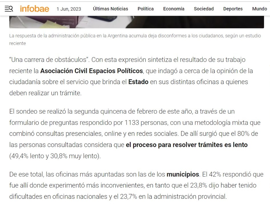 “Una carrera de obstáculos”. Con esta expresión sintetiza el resultado de su trabajo reciente la Asociación Civil Espacios Políticos, que indagó a cerca de la opinión de la ciudadanía sobre el servicio que brinda el Estado en sus distintas oficinas a quienes deben realizar un trámite.
