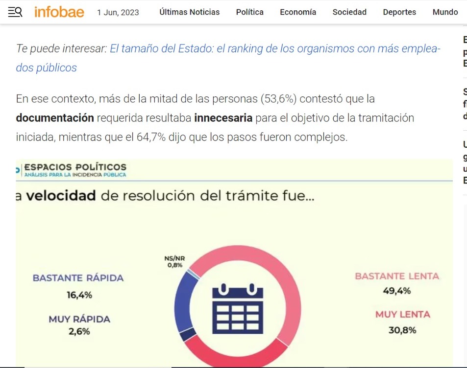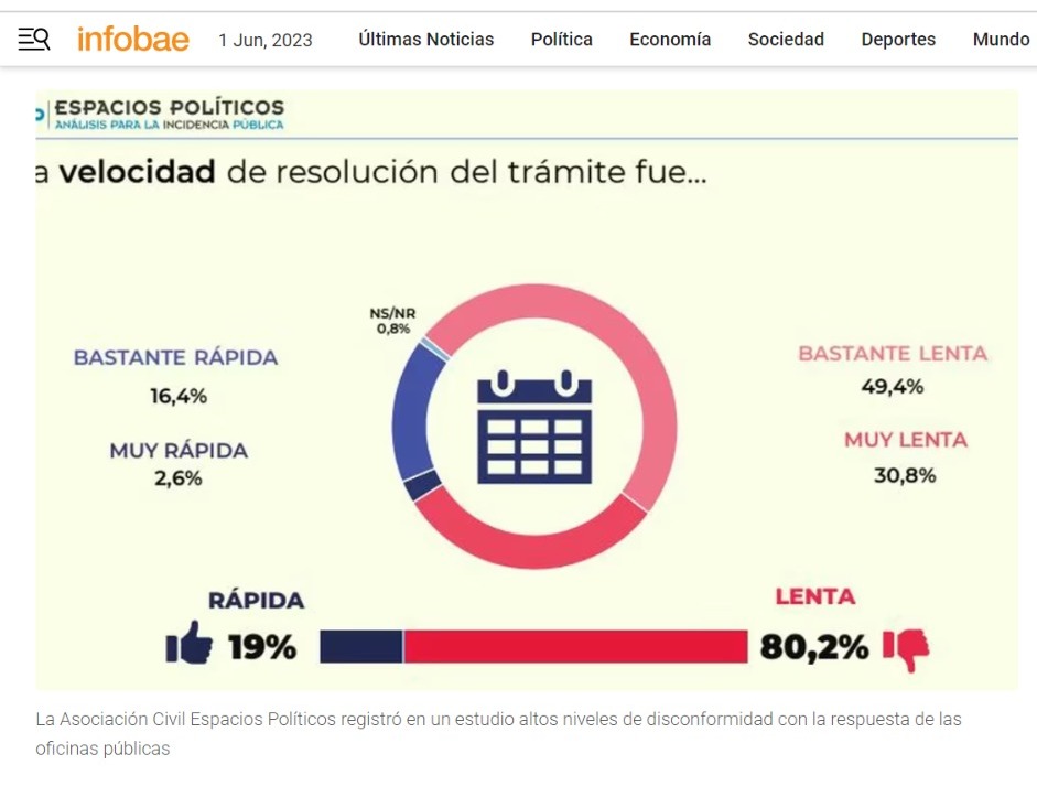 El sondeo se realizó la segunda quincena de febrero de este año, a través de un formulario de preguntas respondido por 1133 personas, con una metodología mixta que combinó consultas presenciales, online y en redes sociales. De allí surgió que el 80% de las personas consultadas considera que el proceso para resolver trámites es lento (49,4% lento y 30,8% muy lento).