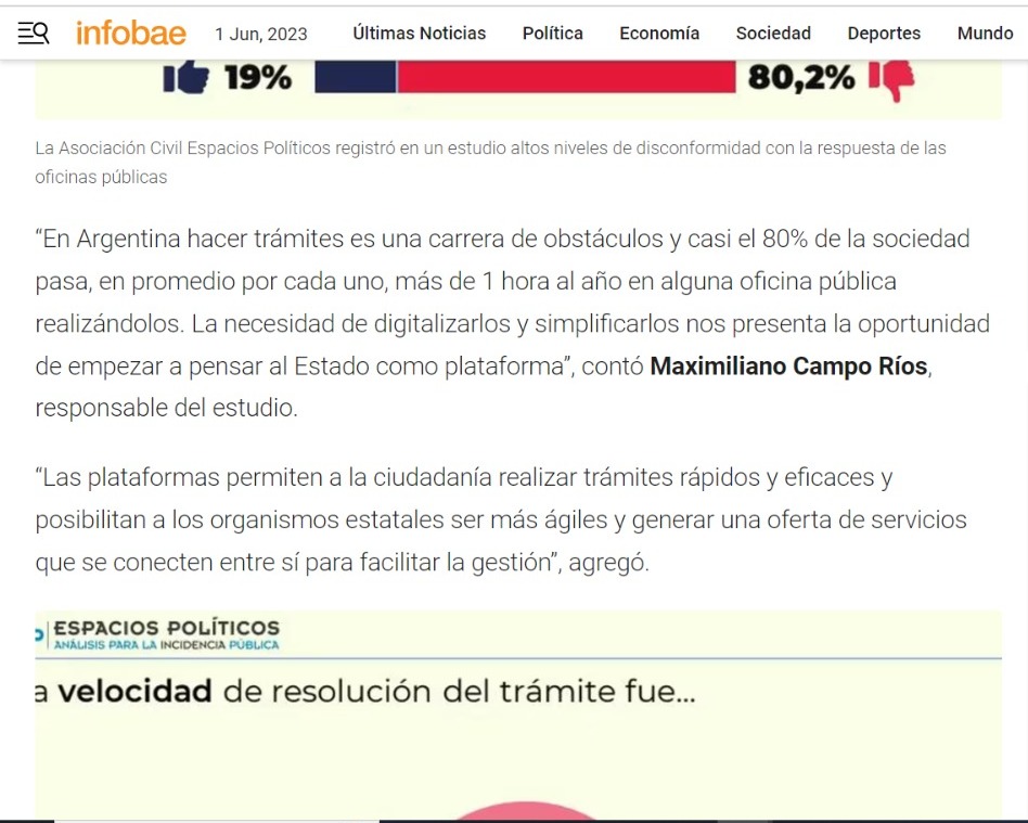 “En Argentina hacer trámites es una carrera de obstáculos y casi el 80% de la sociedad pasa, en promedio por cada uno, más de 1 hora al año en alguna oficina pública realizándolos. La necesidad de digitalizarlos y simplificarlos nos presenta la oportunidad de empezar a pensar al Estado como plataforma”, contó Maximiliano Campo Ríos, responsable del estudio.