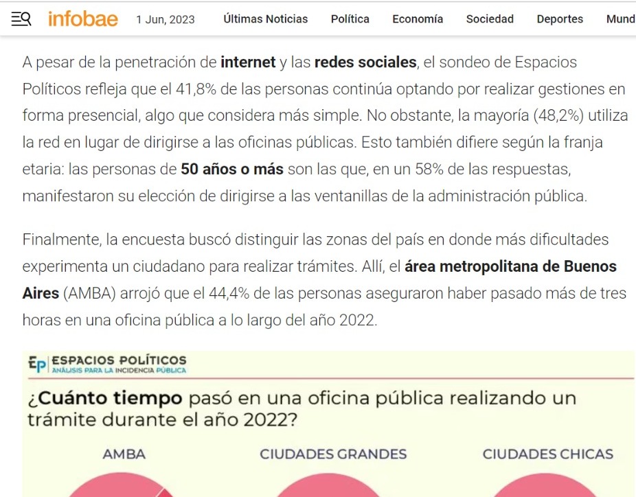 A pesar de la penetración de internet y las redes sociales, el sondeo de Espacios Políticos refleja que el 41,8% de las personas continúa optando por realizar gestiones en forma presencial, algo que considera más simple. No obstante, la mayoría (48,2%) utiliza la red en lugar de dirigirse a las oficinas públicas. Esto también difiere según la franja etaria: las personas de 50 años o más son las que, en un 58% de las respuestas, manifestaron su elección de dirigirse a las ventanillas de la administración pública.