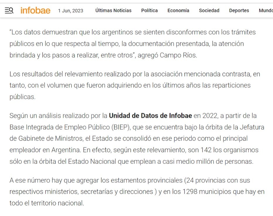 Según un análisis realizado por la Unidad de Datos de Infobae en 2022, a partir de la Base Integrada de Empleo Público (BIEP), que se encuentra bajo la órbita de la Jefatura de Gabinete de Ministros, el Estado se consolidó en ese periodo como el principal empleador en Argentina. En efecto, según este relevamiento, son 142 los organismos sólo en la órbita del Estado Nacional que emplean a casi medio millón de personas.