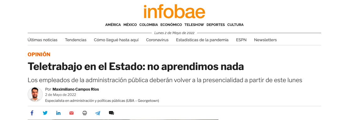 En este panorama, quienes nos dedicamos al estudio de la Administración Pública creemos que los dos años de experiencia de la dinámica del teletrabajo dejaron grandes aprendizajes que deben ser tenidos en cuenta y que decisiones como esta invitan a desconocerlos.