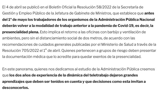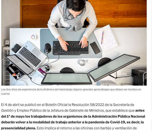 El 4 de abril se publicó en el Boletín Oficial la Resolución 58/2022 de la Secretaría de Gestión y Empleo Público de la Jefatura de Gabinete de Ministros, que establece que antes del 1º de mayo los trabajadores de los organismos de la Administración Pública Nacional deberán volver a la modalidad de trabajo anterior a la pandemia de Covid-19, es decir, la presencialidad plena. Esto implica el retorno a las oficinas con barbijo y ventilación de ambientes, pero sin el distanciamiento social de dos metros, de acuerdo con las recomendaciones de cuidados generales publicadas por el Ministerio de Salud a través de la Resolución 705/2022 el 1° de abril. Quienes pertenecen a grupos de riesgo deben presentar la documentación médica que lo acredite para quedar exentos de la presencialidad.