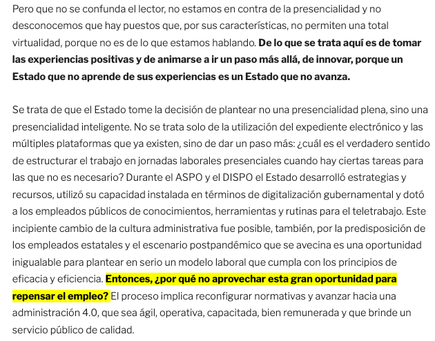 Pero que no se confunda el lector, no estamos en contra de la presencialidad y no desconocemos que hay puestos que, por sus características, no permiten una total virtualidad, porque no es de lo que estamos hablando. De lo que se trata aquí es de tomar las experiencias positivas y de animarse a ir un paso más allá, de innovar, porque un Estado que no aprende de sus experiencias es un Estado que no avanza.