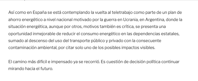 Así como en España se está contemplando la vuelta al teletrabajo como parte de un plan de ahorro energético a nivel nacional motivado por la guerra en Ucrania, en Argentina, donde la situación energética, aunque por otros, motivos también es crítica, se presenta una oportunidad inmejorable de reducir el consumo energético en las dependencias estatales, sumado al descenso del uso del transporte público y privado con la consecuente contaminación ambiental, por citar solo uno de los posibles impactos visibles.