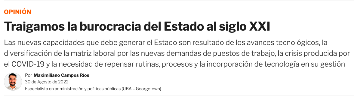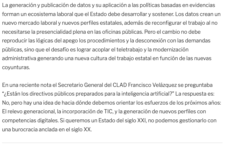 La generación y publicación de datos y su aplicación a las políticas basadas en evidencias forman un ecosistema laboral que el Estado debe desarrollar y sostener. Los datos crean un nuevo mercado laboral y nuevos perfiles estatales, además de reconfigurar el trabajo al no necesitarse la presencialidad plena en las oficinas públicas. Pero el cambio no debe reproducir las lógicas del apego los procedimientos y la desconexión con las demandas públicas, sino que el desafío es lograr acoplar el teletrabajo y la modernización administrativa generando una nueva cultura del trabajo estatal en función de las nuevas coyunturas.