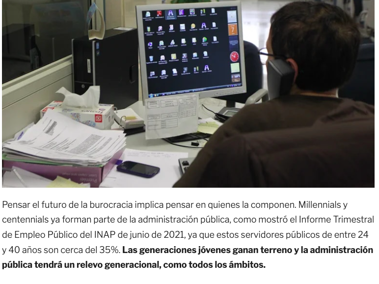 Pensar el futuro de la burocracia implica pensar en quienes la componen. Millennials y centennials ya forman parte de la administración pública, como mostró el Informe Trimestral de Empleo Público del INAP de junio de 2021, ya que estos servidores públicos de entre 24 y 40 años son cerca del 35%. Las generaciones jóvenes ganan terreno y la administración pública tendrá un relevo generacional, como todos los ámbitos.