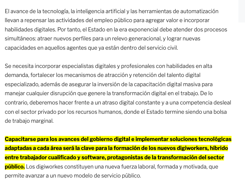 l avance de la tecnología, la inteligencia artificial y las herramientas de automatización llevan a repensar las actividades del empleo público para agregar valor e incorporar habilidades digitales. Por tanto, el Estado en la era exponencial debe atender dos procesos simultáneos: atraer nuevos perfiles para un relevo generacional, y lograr nuevas capacidades en aquellos agentes que ya están dentro del servicio civil.