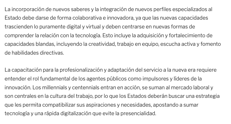 La incorporación de nuevos saberes y la integración de nuevos perfiles especializados al Estado debe darse de forma colaborativa e innovadora, ya que las nuevas capacidades trascienden lo puramente digital y virtual y deben centrarse en nuevas formas de comprender la relación con la tecnología. Esto incluye la adquisición y fortalecimiento de capacidades blandas, incluyendo la creatividad, trabajo en equipo, escucha activa y fomento de habilidades directivas.